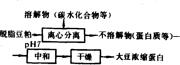图2 酒精水溶液萃取大豆浓缩蛋白的工艺流程 膜分离技术是生产浓缩蛋白的一种先进技术,它借助合成纤维薄膜达到分离物质分子的目的。用这种方法生产的浓缩蛋白,纯度高,质量好,节约能源,具有广泛应用前景。 |