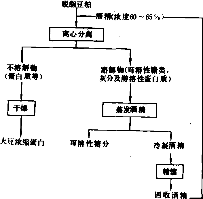 图1 稀盐酸萃取大豆浓缩蛋白的工艺流程 酒精萃取法 工艺流程见图2。将浓度为60%~65%的酒精液喷入盛有低温脱脂豆粕粉的浸洗池中,清洗豆粕中的可溶性糖类,灰分及醇溶性蛋白质。通过离心分离机将溶解物与不溶解物如大豆蛋白质进行分离。分离出的溶解液在蒸发器中蒸发,冷凝器中冷凝,在蒸馏塔内精馏以回收酒精。将分离出的不溶解大豆蛋白质进行喷雾干燥,便可生产出大豆浓缩蛋白。利用酒精提取的大豆浓缩蛋白风味好,蛋白质损失少,但酒精会使蛋白质变性,而且产品中仍含0.25%~1%的不易完全去除的酒精成分。