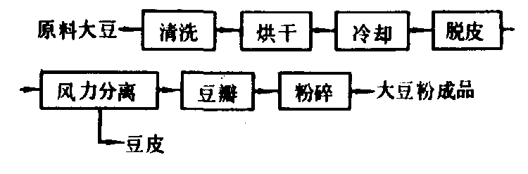 | 释义 | 大豆粉加工soybean powder processing以大豆为原料,经过脱皮,粉碎制得一种粉状产品的过程。大豆粉即生豆粉,分全脂及脱脂两种,一般多为全脂豆粉,常用制豆浆、豆腐脑和豆腐的原料。全脂豆粉生产工艺流程见图。