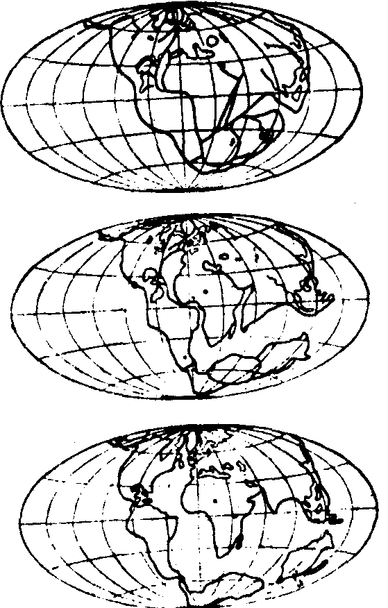 图1 大陆在漂移过程中的几个时代的位置 (魏格纳,1915) (上为晚石炭世,中为始新世,下为早更新世)