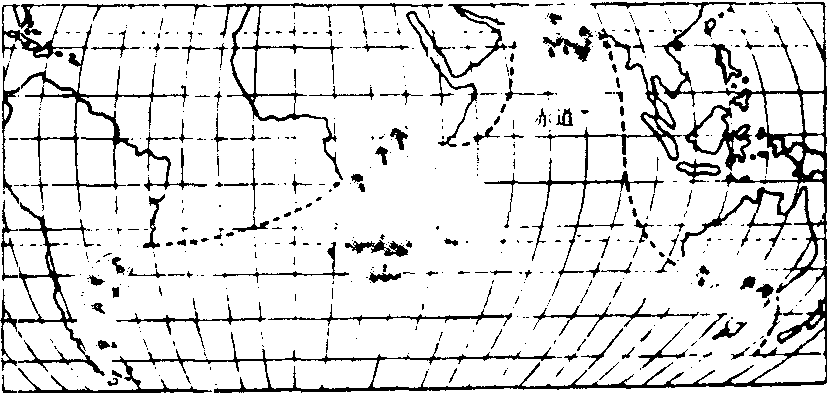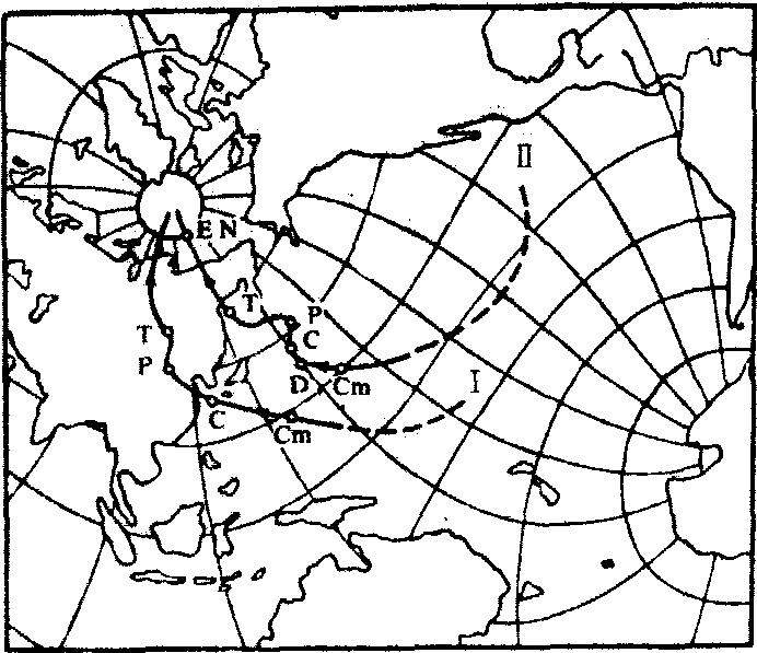 图2 石炭一二叠纪冰川分布图 (暗色部分为冰川分布范围,箭头表示冰流方向) 50年代以来,古地磁学有很大的发展。它是研究亿万年前所形成的岩石中保存下来的剩余磁性的一门科学。近年用古地磁方法已经确定出古地磁极的位置,发现在地质时期磁极是移动的,并且根据各时代所测出的磁极位置可以绘出磁极迁移的轨迹,称为极移曲线。但从北美和欧洲却测定出两条极移曲线来,二者大致平行(图3)。如果大陆自古以来其位置是固定不变的,则只应得出一条极移曲线;如今得出两条,说明欧美大陆原先是连在一起,后来逐渐漂移分离,直到形成现在的位置,才能解释这种现象。因此,地壳固定论的概念发生动摇,而大陆漂移说又获得了新生,与此相关,地壳活动论的观点也日益受到人们的重视。