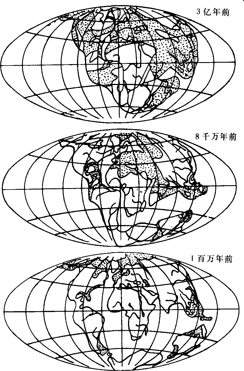 ❸上石炭纪冰川只发生在南半球的大陆上,而当时北半球都无冰川现象痕迹,这是由于当时联合古陆的南半部漂移经过南极地区所引起。