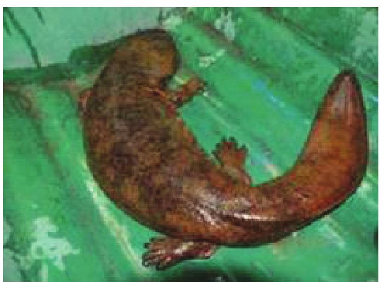 图287 大鲵 大鲵Andrias davidianus脊椎动物,两栖纲,有尾目,隐鳃鲵科。体长60~70厘米,大者可达1.8米以上,体重20~25千克,为现存最大的两栖动物。体型扁平,皮肤黏滑。体背棕褐色,上有深浅不同的大黑斑,腹面色淡。头宽而扁,上下具有明显成对疣粒。口大,鼻孔和眼极小,位于头的背面,无眼睑。躯干粗壮,尾部发达,后端侧扁,粗而有力;四肢短小,前肢4指,后肢5趾,趾间有微小的蹼。在前后肢之间自颈侧至体侧有明显皮肤皱褶。栖息于山谷水质清澈的溪流中,白昼伏于洞穴中,傍晚后活动,尤其喜在水温较低的地方游动。以鱼、蛙、虾、蟹和螺等为食。因传说“叫声似小孩啼哭”,故长期以来有“娃娃鱼”的俗称,但少有人直接听到过。产于我国长江流域中下游的支流地区。由于肉味鲜美,曾遭到大量捕食,数量显著减少,现已被列为国家二级保护动物,禁止捕杀、收购和食用。老年人应拒食,并劝阻青年人也勿食。 大鲵giant salamanderMegalobatrachus davidianusBlanchard,两棲纲,蝾螈目,隐鳃鲵科。 长60~70 cm,大者长达1.8 m,重达60 kg。是现存的最大两栖动物。头宽而扁。口大。上下颌具多数大小相似的细齿。鼻孔和眼极小,位于头背,无眼睑。躯体粗壮而扁。尾侧扁。四肢短,前肢4指;后肢5趾,趾间有微蹼。皮肤光滑;头部有显著疣粒。自颈侧至体侧有皮肤褶。体外受精,卵带串珠状,亲体有护卵习性。栖于山区水质清澈、水温低、深潭多的流溪中,白天潜居洞内,傍晚以后出洞觅食。性凶猛,捕食蛙、蟹、鱼、蛇、鳖等。因叫声似孩啼,故俗称“娃娃鱼”。除东北、内蒙古、宁夏、新疆、西藏、山东、云南、台湾及海南岛外,其他各地均有分布。为中国国家二级保护动物。