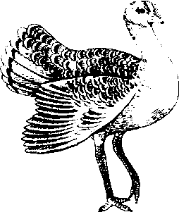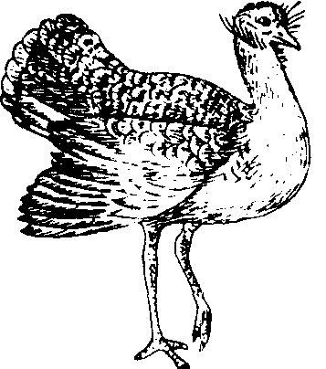 图348 大鸨 大鸨great bustardOtis tarda dybowskii Taczanowski,又称地鵏。鸟纲,鹤形目(Gruiformes),鸨科(Otidae)。体长约1 m。头、颈和前胸深灰色。喉部近白色,雄鸟喉侧被有向外突出的细长纤羽,似山羊鬍须,因此有羊须鵏之称。上体棕色杂以黑斑,下体自前胸以下纯白色。两翼大都灰白,而飞羽黑。雌鸟较小,喉侧无须。常群栖于草原,善于奔驰。性杂食,主要以嫩绿野草为食,兼食谷类等农作物,育雏期间捕食蝗虫等昆虫。繁殖时巢极简陋,为一浅土坑,每窝产卵2~3枚,卵较大,重达130 g,雌雄鸟轮流孵卵,恋巢性较强。夏季在中国东北、内蒙古草原繁殖,秋季迁至华北平原及长江流域越冬。中国一级重点保护鸟类。