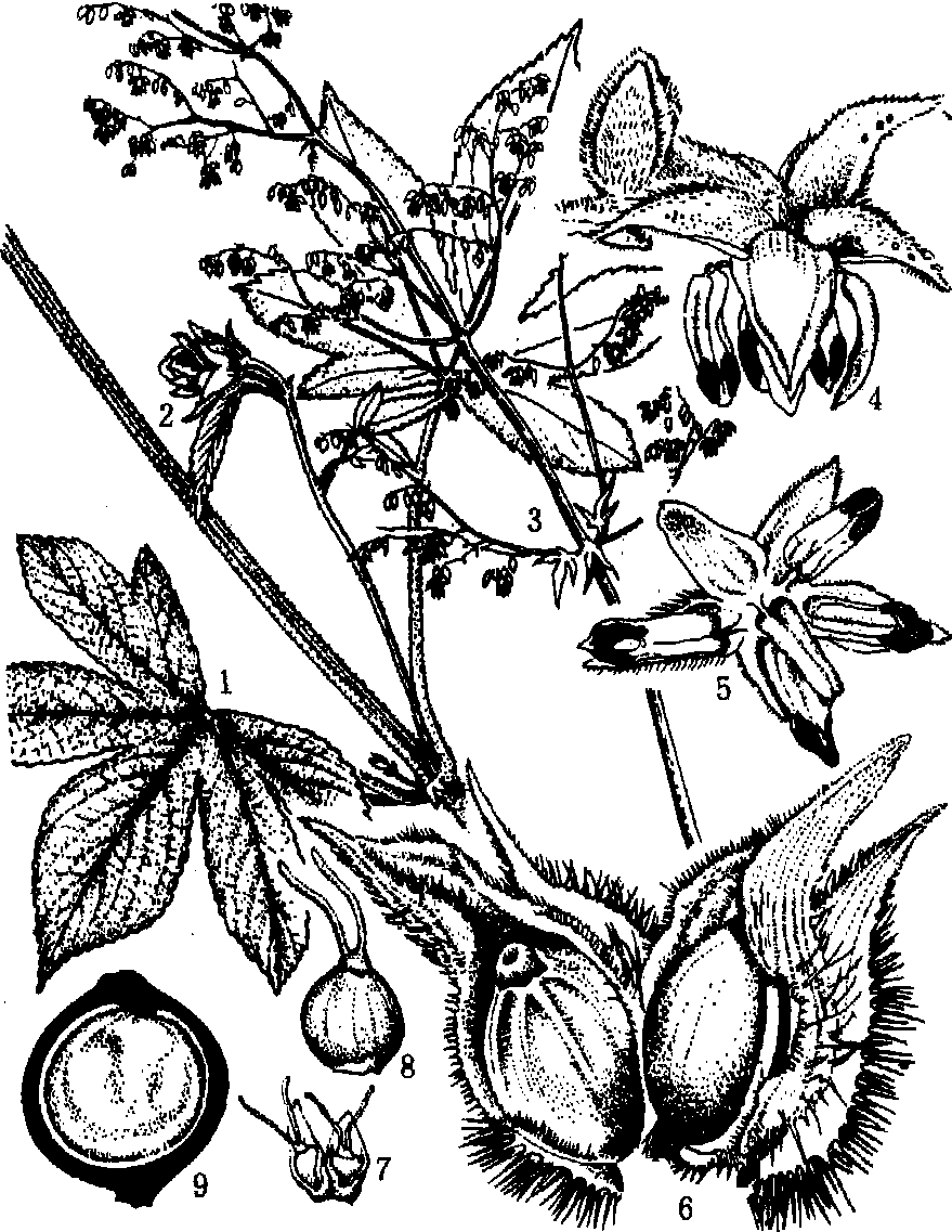 大麻科Cannabaceae双子叶植物,直立或缠绕草本。叶互生或对生,掌状裂。花单性,常异株;雄花为圆锥花序,雌花聚生于叶腋;雄花萼片5枚,雄蕊5枚,与萼片对生,花粉具3孔,稀2、4或6孔;雌花具一膜质短萼管,紧贴子房,子房上位,心皮2,1室,胚珠1枚。坚果或瘦果,有宿存花萼。种子具弯曲或螺旋的胚和少量胚乳。染色体x=8(葎草属),10(大麻属)。本科2属,5种。葎草属分布北温带,忽布种子含挥发油,掺入麦酒中可增加香味,亦为健胃药物。葎草为常见杂草,也可供药用。大麻属只有大麻1种,经过长期栽培,形成为一个北方原亚种,为纤维用植物;一个热带亚种,主要为治疗神经药物。中国有2属,4种,大麻属各地均有栽培,葎草属盛产西南至东南部。 |