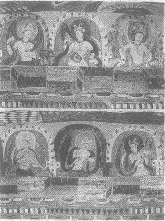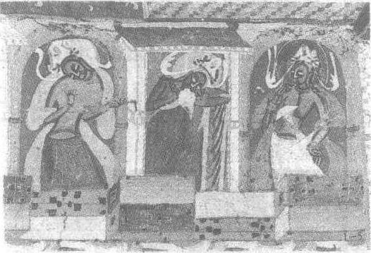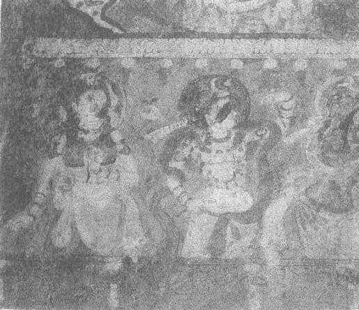 天宫伎乐图壁画北魏。纵85厘米,横110厘米。甘肃省敦煌县莫高窟第435窟北壁上层壁画。此天宫形式并未单一地采用穹窿顶,而是与汉民族典型的四阿式楼阁两者并用,显得更为丰富。天宫以浓重的深色作底色,三位伎乐天身着袒右肩袈裟或裸上身,姿态各异。中间一位吹海螺,两旁各有一位分别演奏腰鼓和曲颈琵琶,其表情动作乃至手型描绘得十分生动,具有轻柔、舒展的韵律感。如果绘画者不是对歌舞表演十分熟悉而有兴趣的话,是不可能创作出这些形象的。舞者的用色以深色调为主,具有剪影效果。她们的披巾和长裙上多以白线勾勒,醒目而又久不变色,专家们称之为“提神线”。