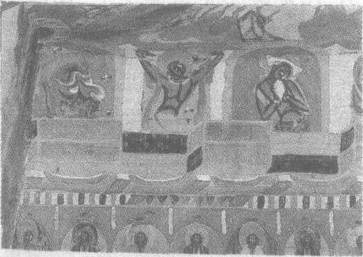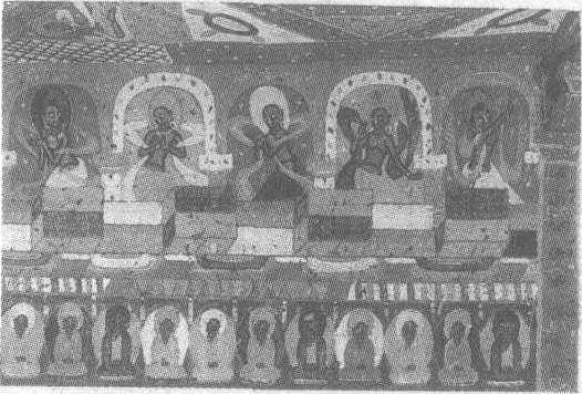 天宫伎乐图壁画西魏。纵93厘米,横110厘米。甘肃省敦煌县莫高窟第288窟西壁上层壁画。天宫皆西域式穹窿顶建筑。伎乐上身裸露,仅有长巾绕肩飘扬,形成一条条活泼的曲线。伎乐丰肩窄腰,青春的肌体十分健美。面庞秀丽,双目炯炯有神,表情各异。弹琵琶,吹螺号,击腰鼓,奏乐的各司其职。舞者皆作翩翩舞姿。绘画线条极为清晰,天宫伎乐的形象及绘画技法显示出新的特点。