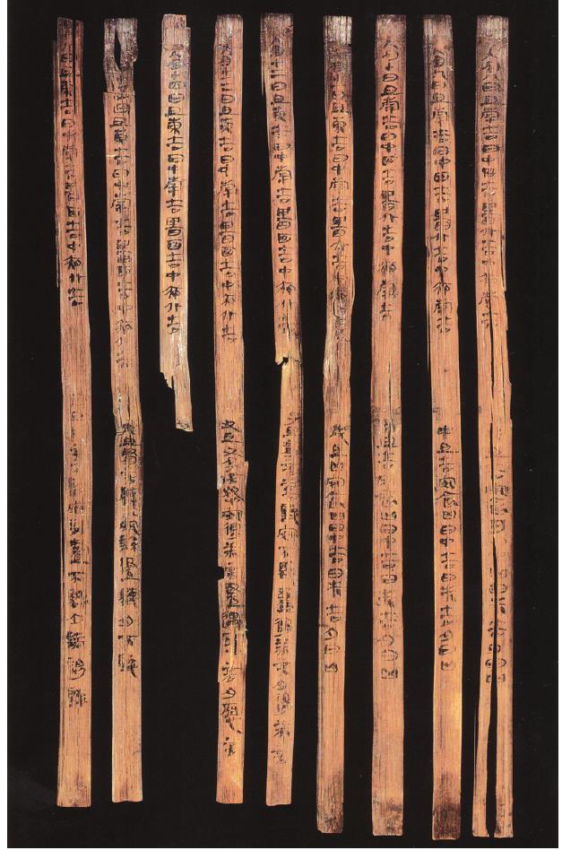 放马滩出土的简牍 天水放马滩秦简1986年4月在甘肃天水市北道区党川乡放马滩1号秦墓中出土。共计460枚,内容为甲、乙两种《日书》、《墓主记》及神话传说故事。乙种《日书》系抄自甲种,与湖北云梦睡虎地秦简 《日书》基本相同。《日书》为当时民间流行的占卜书籍,涉及到婚嫁、生丧、修造、出行、农事等日常生活的许多方面,含有天文、历法、音律、农业等科学知识, 是研究战国、秦时期社会历史的重要资料。释文见甘肃人民出版社 《秦汉简牍论文集》。现藏甘肃省文物考古研究所。 |