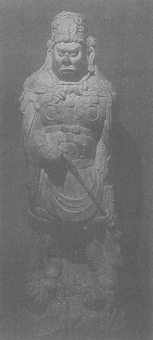 北宋。通高186厘米。上海博物馆藏。天王头戴饰花冠盔,身着铠甲,足蹬战靴,右手捏金刚杵柄端于腹前,左手握金刚杵头际于腰旁,脚踏两个惊恐万状、趴地挣扎的夜叉,岿然而立。其额头狭窄,两腮肥腴,浓眉紧蹙,虎眼圆睁,嘴角下撇,威武雄壮,令人望而生畏。