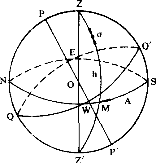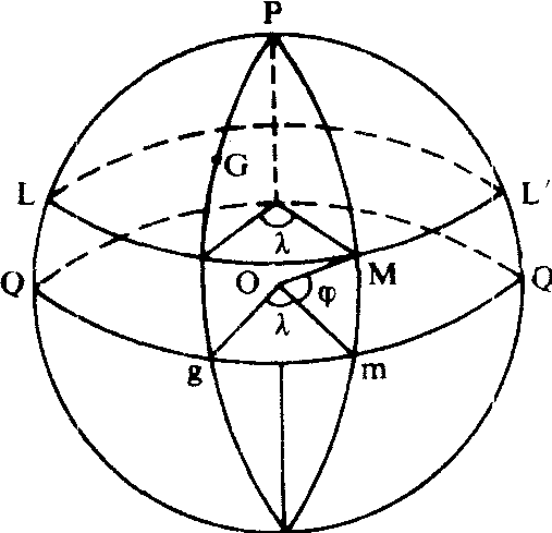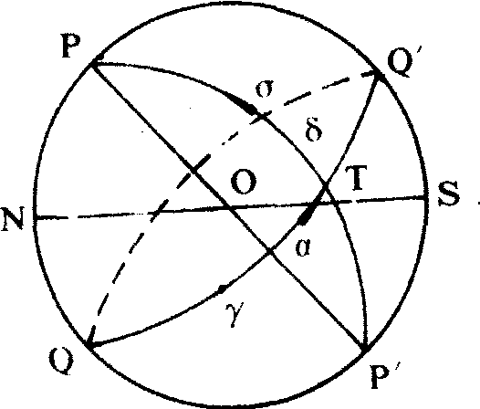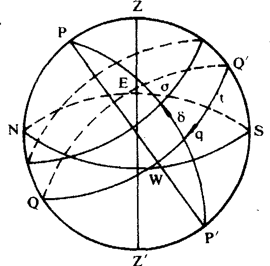 图1 地面点的地理坐标 天球坐标系与地理坐标系定义类似,只是根据不同的需要设置不同的基本圈和原点,从而得到四种不同的坐标系。观测者所在地铅垂线的延长线与天球相交的二点,上面为天顶,下面为天底;和铅垂线垂直的平面与天球相交的大圈为地平圈。设地平圈为基本圈,天顶、天底为极,南点(地平正南方)为原点,(有时也以北点作为原点)。过天顶和被观测天体作一大圆,垂直于地平圈,则从南点沿地平圈顺时针度量到垂足的角度叫地平经度(或方位角)A,从垂足沿大圆(或叫地平经圈)度量到被观测天体的角度叫地平高度h,向北为正,向南为负。这个坐标系叫地平坐标系(图2)。过天球中心作与地球赤道平行的平面交天球于一大圆,这个大圆是天赤道,天赤道的两极是天北极和天南极。过天顶、天北极北点、南点的大圆为天子午圈,天子午圈与天赤道交于一点Q′。设天赤道为基本圈,天北极、天南极为极,Q′点为原点。过天北极,将被观测天体看作一大圆(叫赤经圈),垂直于天赤道,则从Q′点沿天赤道顺时针度量到垂足的角度叫时角t,从垂足沿赤经圈度量到被观测天体的角度叫赤纬δ,向北为正,向南为负。这个坐标系叫时角坐标系(或第一赤道坐标系)(图3)。过天球中心作平面与地球公转轨道面平行,与天球相交的大圆叫黄道,黄道与天赤道相交于春分点和秋分点,春分点是黄道由赤道以南穿到赤道以北时的交点。设天赤道为基本圈,春分点(记作γ)为原点。从春分点沿天赤道逆时针度量到过被观测天体的赤经圈垂足的角度叫赤经α,从垂足沿赤经圈度量到被观测天体的角度叫赤纬δ,这个坐标与时角坐标系的赤纬相同。这个坐标系叫赤道坐标系(或第二赤道坐标系)(图4)。设黄道为基本圈,它的极是北黄极和南黄极,春分点γ为原点。过北黄极和被观测天体作一大圆,又叫黄经圈,垂直于黄道,则从春分点沿黄道逆时针度量到垂足的角度叫黄经λ; 从垂足沿黄经圈度量到被观测天体的角度叫黄纬β,向北为正,向南为负。这个坐标系叫黄道坐标系(图5)。当天体作周日视运动时,四种坐标系中,地平坐标系的两个坐标以及时角坐标系中的时角坐标都是随时间和地点变化的量,而时角坐标系中的赤纬以及赤道坐标系、黄道坐标系中的坐标均不随时间和地点变化。已知某天体的两个坐标时,可以由公式换算成另外坐标系中的坐标值。