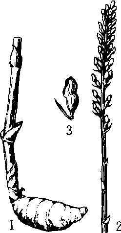天麻 1.块茎 2. 花序 3.花 天麻较常用川产道地中药材,兰科多年生寄生植物天麻的干燥块茎。又称明天麻、赤箭。始载于《神农本草经》。药材外观呈长圆形或椭圆形,皱缩,有时弯曲,表面白色或黄色,微透明,全身有明显横白环纹,顶端有红棕色芽苞或残基,习称“鹦哥嘴”,下端有圆脐形的疤痕,习称 “肚脐眼”。主要药用成分为天麻甙。性平,味甘,具有熄风、平肝等功效。主产于宜宾、乐山、万县等地30余县。过去全为野生,现有栽培品,一般冬、春两季采挖。质地坚实沉重、有鹦哥嘴、断面明亮、无空心者称冬麻,质佳; 质地轻泡、有残留茎基、断面色晦暗、空心者称春麻,质次。中华人民共和国成立前最高年产达60吨,1960年~1965年期间年均收购33吨,居全国第一,占全国的30%以上,以后逐年下降。1958年开始进行种植探索,1968年四川省中药材公司和四川省中药研究所南川药种植场种植获得成功,现全省30余县开展种植,家种品已成为主流,年产约100吨。 天麻兰科天麻属多年生腐生直立草本, 甘肃产于天水、康县、武都、文县一带山区,生于林下阴湿腐殖质厚的土壤。该种分布面广,经济价值高,药用块茎作强壮剂, 用于医治眩晕、头痛及神经衰弱等。由于采挖量大,致野生数量已经很少,目前各地多进行人工栽培。野生种列为国家二级保护植物。 天麻兰科天麻属多年生草本植物。球茎,地上茎高100~130 cm。叶退化为鳞片状。总状花序顶生,花期5~6月,蒴果长圆形,有6条纵缝线。果内有种子2万~4万粒。果熟期6~7月。野生天麻一般生长于海拔1200~1800 m的高山。生长周期2年。 |