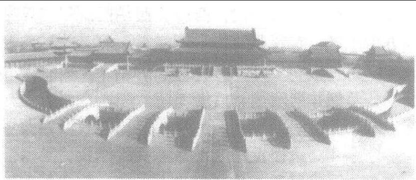 | 释义 | 太和门北京紫禁城中的门楼,为紫禁城外朝三大殿的正门。穿过午门是一宽阔的广场,内金水河横贯其中,跨过内金水桥,即是太和门。明初,太和门称奉天门,后又改称皇极门。清顺治三年(1646) 重修,改称太和门。嘉庆七年 (1802) 又修。太和门九楹三门,重檐崇基,前后陛各三出,左右各一出,高23. 8米。陛间列古铜鼎4,门前列铜狮2,还置有各式古雕。明代,这里是 “御门听政”之处。大厅中央设宝座,取名 “金台”。宝座后是四扇鎏金雕龙屏风,屏风前插两把金黄绢制成的巨扇,寓意是 “卓影辟邪”。每天拂晓,百官到太和门候朝,皇帝坐御台宝座接受朝拜,处理政事。《圣武记》记载: “顺治元年(1644) 九月,世祖章皇帝车驾发盛京,十月朔,定都燕京,祭告天地社稷,奉太祖、太宗神主入太庙,颁诏中外,大赦,其文臣衣冠暂以明制。上御皇极门,授吴三桂平西王敕印。”清朝皇后死后赐谥号典礼在太和门举行。康熙年间,皇帝常在太和门举行盛大宴会。太和门从明永乐十八年 (1420) 建成后,遭到多次火灾。如光绪十四年 (1888) 十二月,因雷击起火,太和门被梵毁。第二年正月是光绪帝大婚的时间,工匠们只好临时用木杆彩绸搭起了外形与太和门完全相同的一座门楼,发挥了他们的高超技艺。太和门左右两侧分别是昭德门和贞度门。太和门后东庑33间,中为体仁阁,阁内供奉先帝遗容,储存皇帝甲胄和太后玉宝,、玉册,也是殿试选士的地方; 西庑也是33间,中为弘义阁,为银库所在地,收藏金、银、钱币、宝石器等珠宝。