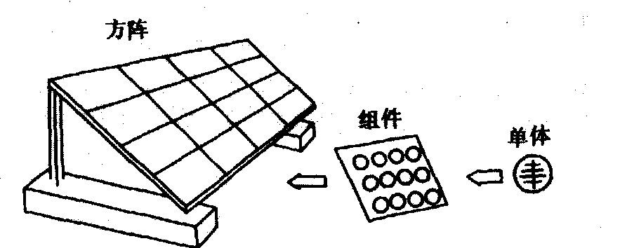 图2 太阳电池单体、组件和方阵 太阳电池发电系统一般由太阳电池方阵、防反充二极管、储能蓄电池、充电控制器、逆变器及测量设备组成(图3)。