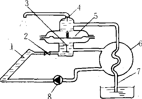 1.集热器 2.进气阀 3.汽缸 4.上单向阀 5.隔膜泵 6.冷凝器 7.下单向阀 8.工质泵