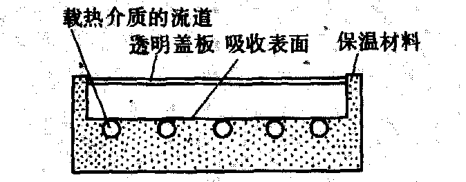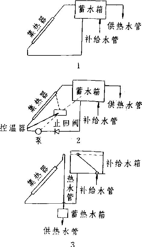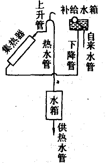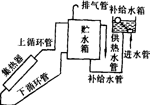 图1 平板型集热器构造示意 太阳能热水器按水流动方式分为循环式、直流式及整体式。循环式又分为自然循环式及强制循环式。图2是自然循环式的一种,集热器吸收太阳辐射,水温高于贮水箱中水温,二者间密度差形成热虹吸压头而对流循环。自然循环式结构简单,运行可靠,贮水箱底需高于集热器顶0.3~0.5米。在室外需保温,且需考虑建筑布置及屋顶荷重等问题。强制循环式靠泵使水在集热器和贮水箱间循环,当集热器出口水温大于贮水箱一定温度时,由系统自动控制装置启动水泵运行。