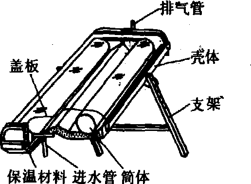 图4 热虹吸型直流式热水系统 整体式或称闷晒式(图5)是将集热器和贮水箱合一,水在容器内不流动。太阳辐射加热整个容器之水,傍晚即可使用。这种装置结构简单,体积小并且成本低廉,适于家庭使用。