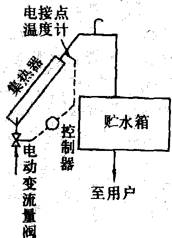 图2 自然循环式热水系统 直流式分为定温放水型及热虹吸型。图3中集热器出口装有按热水要求调整好温度值的电接点温度计,它通过控制器操纵电动变流量阀开、闭或改变流量,使出口水温始终保持在设定值。图4中补水箱水位与集热器出口上升管最高位置一致。集热器吸收太阳辐射、水温升高,形成热虹吸压头,热水经上升管流入贮水箱,冷水自动经下降管补入。