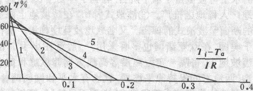 FR是和集热器采用材料的性能、结构以及水的传热有关的一系数。盖板多采用透明度高的玻璃或塑料板。(τα)愈大,吸收的能量也愈多,为增大α值,常采用特殊的选择性涂料。为减少热量损失,集热器的四周和底部通常采用一定厚度的绝热材料加以保温,如矿渣棉、玻璃棉、珍珠岩、锯末、聚苯乙烯等。太阳辐射强度以垂直于地面的值为准。 公式中的FR、τ、α、和UL近似常数,而I、Ti和Tα则是变化的,因而上式可用近似直线表示,称为集热性的特性曲线。图6是5种不同结构热水器的特性曲线。曲线1是一种无盖面的集热器,斜率很大,仅适用于夏季,尤其适合加热游泳池水。曲线2是有一层玻璃盖面,吸热板采用一般黑漆的集热器,它适合在5~10月间生活用热水。曲线3是有一层玻璃盖面,吸热板采用选择性涂料的集热器,适合于生活用热水,但时间可更长一些。曲线4是有二层玻璃盖面,吸热板采用选择性涂料的集热器,它适用于寒冷地区。曲线5是一种真空管集热器,在冬季也能使用。