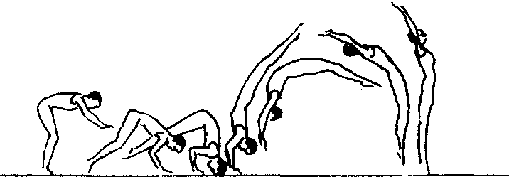 | 释义 | 头手翻经头、手支撑,做向前(有腾空)翻转1周的动作。动作要领:直立,上体前屈(稍屈膝),两手向前撑地,接着两脚蹬地,两臂弯曲,用头的前额在两手间稍前处顶地。经短暂的屈体头手倒立,当臀部超过支撑垂面后,两腿用力向前上方伸压,充分展髋,同时两手用力推离地面,使身体向前上方腾起,抬头、挺胸保持体后屈,然后以前脚掌着地成两臂上举站立。保护与帮助:保护者单腿跪立在练习者前侧方,一手反握练习者的上臂,另一手托其腰胯,助其翻转。教学重点:初学时,可用3人帮助,练习者做好屈体头手倒立姿势,两个保护人在练习者两侧,一手握其上臂,另一手托腰胯;另1人在后面用手握住他的踝关节,促其重心前移,当臀部超过垂直面后,立即向前方上撩腿,使其体会头手翻动作的全过程。然后在助力下做完整动作练习。
