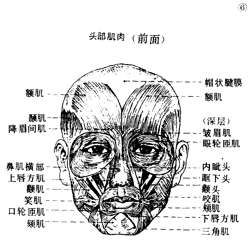 分为表情肌、咀嚼肌。表情肌:有眼轮匝肌、额肌、皱眉肌、降眉间肌、鼻肌(横部、翼部)、口轮匝肌、上唇方肌(内眦头、眶下头、颧头)、下唇方肌、颧肌、三角肌、犬齿肌、笑肌、颊肌、颏肌。咀嚼肌:有颞肌、咬肌。头顶有帽状腱膜,前连额肌,后连枕肌(见图4❻图5❶)。