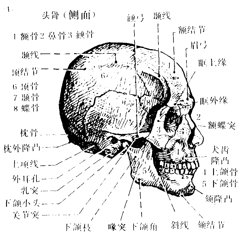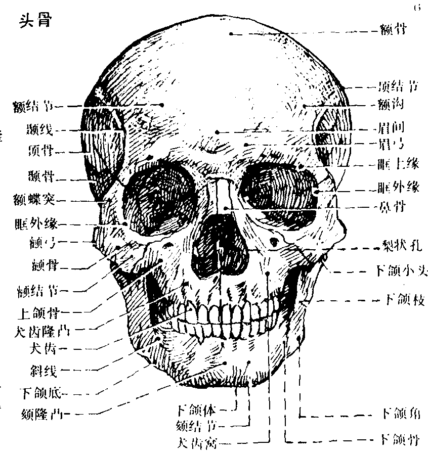 | 释义 | 头骨分为脑颅骨和面颅骨。脑颅骨:是四周围住脑子的骨骼,前有额骨,头顶有顶骨,后有枕骨,两侧有颞骨。面颅骨:是在头部正面,中有鼻骨、上颌骨。两侧有颧骨,下有可活动的下颌骨。头部肌肉较薄故骨形显露(见图2