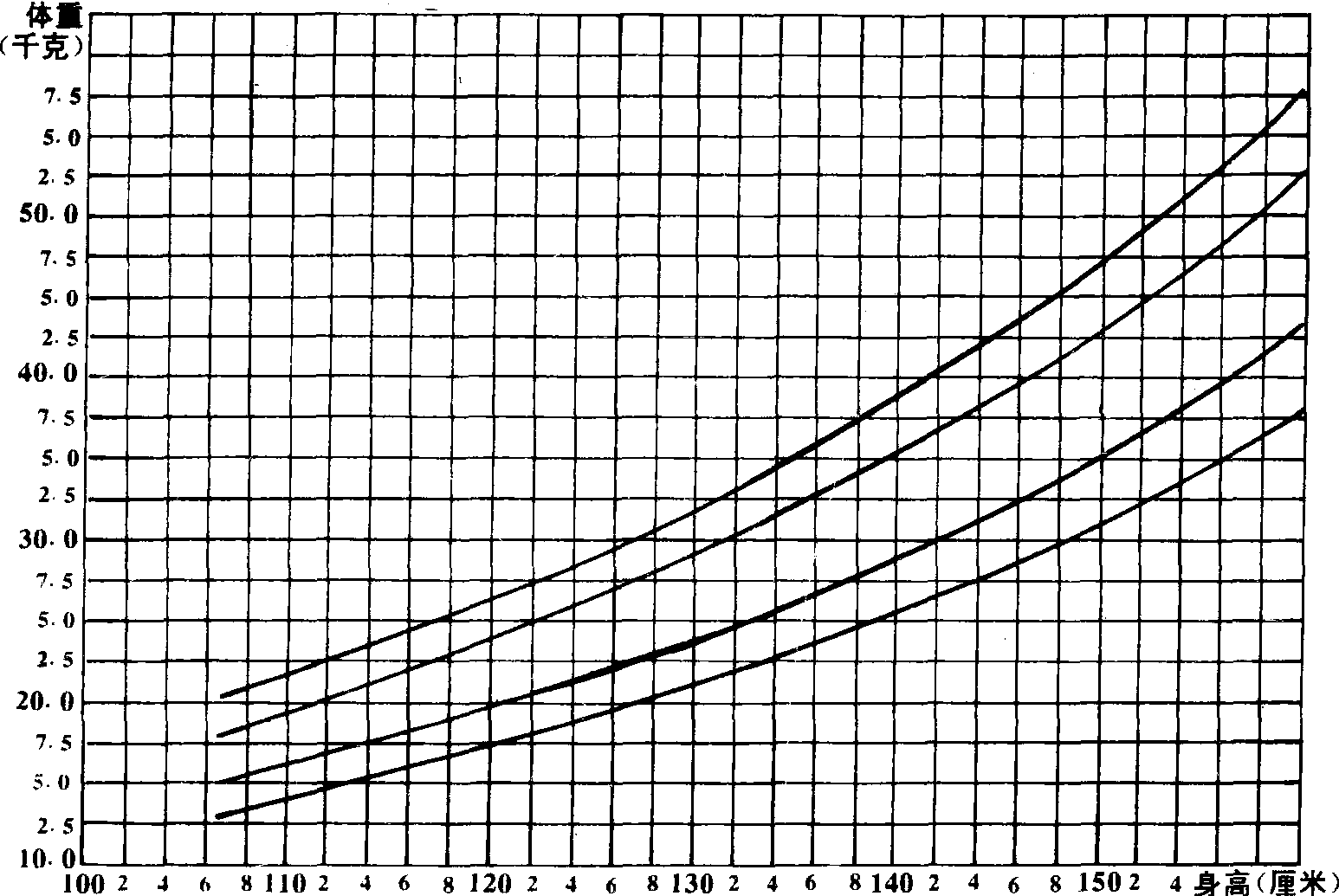 | 释义 | 女少年肥胖的判断标准肥胖就是人体内脂肪过多。但脂肪多到什么程度才算肥胖呢? 判断肥胖的方法很多,目前,在我国应用较多的是“身高标准体重法”。所谓身高标准体重是以大量发育正常儿童的身高和体重为依据制订的某一身高时的标准体重。通常在标准的±10%以内为正常范围,比标准大10%—20%为超重,比标准大20%以上为肥胖(如体重小于正常范围为低体重或营养不良)。例如,7—12岁女孩身高140.0厘米的标准体重为33.0千克,那么29.7—36.3千克为正常范围,36.3—39.6千克为超重,超过39.6千克为肥胖。超过得越多,肥胖越严重。为了使用方便可以将每一厘米身高的标准体重制成曲线图。图3.4-1、图3.4-2是根据全国学生体质研究资料制成的女孩标准体重曲线图,可以以此图判断体重是否正常。图3.4-1适用于7—12岁女孩,图3.4-2适用于13—15岁女少年。两个图左侧纵轴是体重值,下方横轴是身高值;图上各有四条曲线,第2、3两线之间为体重正常范围,第1、2两线之间为超重,第1条线以上为肥胖,离开第一条线越远,肥胖越严重;第3、4两线之间为低体重,第4线以下为营养不良。评定时,首先根据年龄选择图3.4-1或图3.4-2,以后在横轴上找到儿童相应身高的一点,向上作垂直延长线;再在纵轴上找到儿童相应体重的一点,向右作水平延长线;根据两延长线相交的位置判断儿童体重是否正常。例如某一女孩,11岁,身高138.0厘米,体重38.5千克,选择图3.4-1评定,身高与体重所在点的延长线相交于第一条曲线的上方,故评定该女童为肥胖;又如另一女童14岁,身高152.0厘米,体重45.0千克,选择图3.4-2评定,身高与体重延长线相交于第2、3曲线内,故该童体重属正常范围,不肥胖。