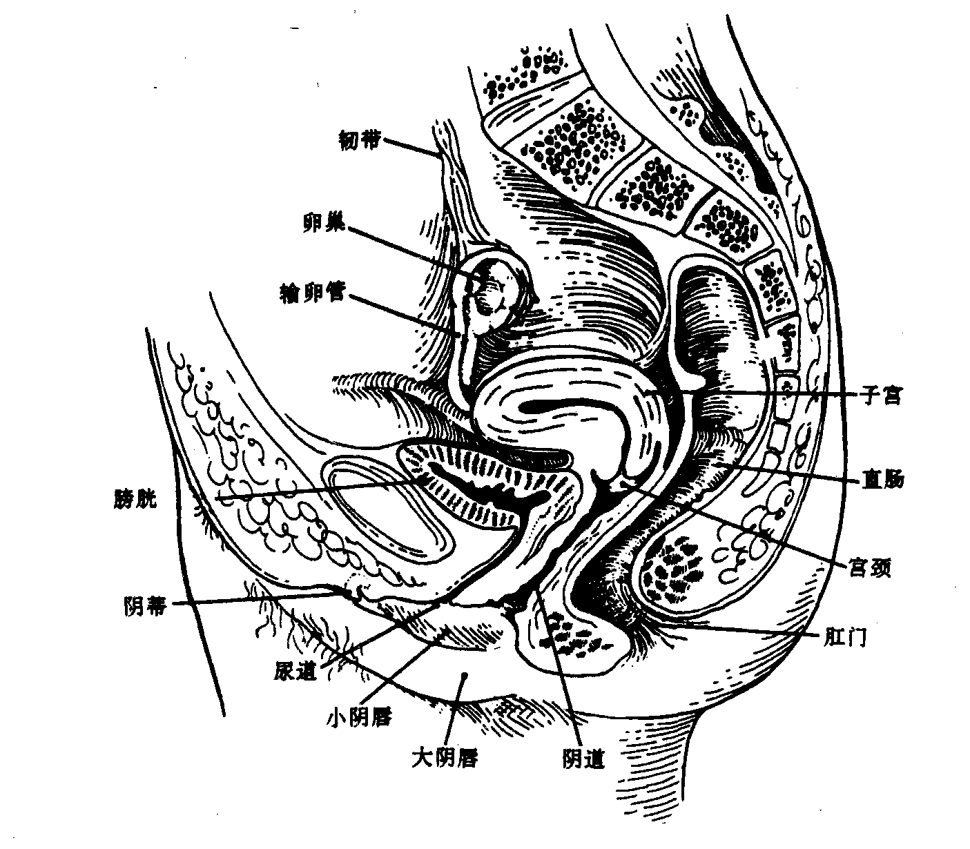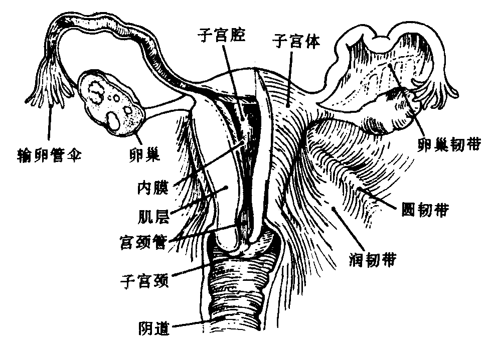 女性的主性器官为卵巢,副性器官有输卵管、子宫、阴道和外阴等。如图1.11-1及图1.11-2所示,卵巢位于盆腔内子宫两侧的后上方,呈卵圆形,左右各一,通过系膜、韧带与子宫相连,并悬于小骨盆侧壁上。卵巢具有产生卵子和分泌激素双重功能,因此又称性腺。卵子通常自一个卵巢排入腹腔后,随即被输卵管捕获,输卵管为细长的肌性管道,一端紧靠卵巢(不接连),另端与子宫腔相通,管壁由粘膜、肌层和浆膜三层组成,通过粘膜上皮纤毛向子宫方向的摆动和肌层的蠕动将受精卵输送到子宫内(卵子在输卵管内受精)。子宫位于直肠与膀胱之间,为中空器官,形状和大小像一个倒置的梨,是胎儿发育的地方。子宫壁从内到外分为三层: