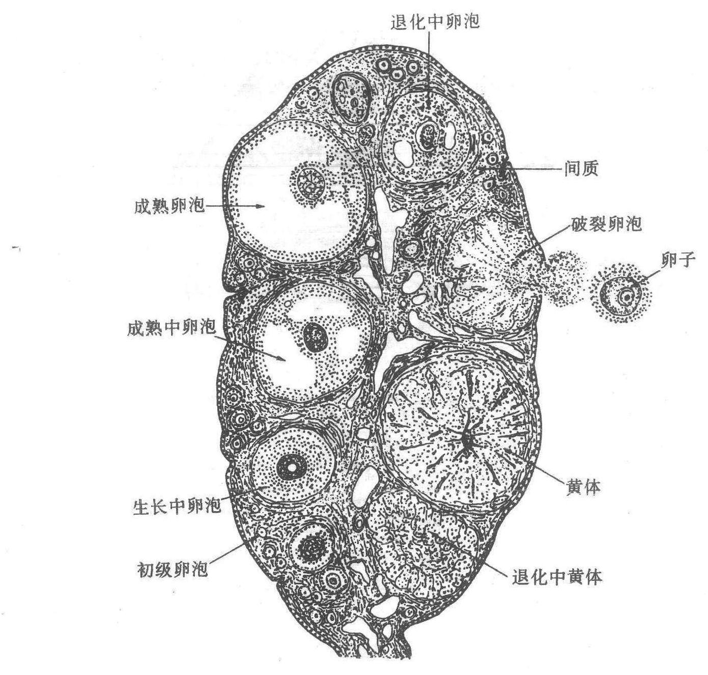 ❸浆膜,为覆盖于子宫外的腹膜。阴道是有扩展性的管道,阴道与宫腔以较细的宫颈管相通,射入阴道的精子通过宫颈管进入子宫后再到达输卵管,使卵子在输卵管内受精。阴道外口周围为外阴,包括大、小阴唇和阴蒂等。在胚胎期,卵巢内产生大约700万个生殖细胞,但一生中仅有400—500个发育成熟,其余均退化。从青春期开始,通常大约每28天产生一个成熟卵子,称为一个卵巢周期。在卵巢周期中,卵子的成熟过程和激素的分泌情况大致如下(见图1.11-3):周期开始时,卵细胞由单层上皮包围而形成初级卵泡由于上皮细胞增殖而使卵泡逐渐长大,并形成空腔,其中充满液体,卵细胞被挤到卵泡的一侧。同时,卵泡在成熟过程中分泌越来越多的雌激素和小量孕激素,并逐渐移到卵巢表面,随后卵泡膜和卵巢外膜破裂,卵子及其周围的一层细胞从破口处排出,此过程称为排卵。从初级卵泡发育为成熟卵泡的时间约为2周。排卵后,残留在卵泡膜内的细胞增生、肥大而形成黄体,黄体的主要功能是分泌孕激素和雌激素,如果卵子受精而开始妊娠,黄体则继续生长,并分泌大量孕激素,直到妊娠4个月左右才逐渐萎缩,这时,胎盘已能取代黄体分泌足够的孕激素,以满足维持妊娠的需要。如卵子未受精,则黄体仅维持2周左右便萎缩。雌激素和孕激素也随之减少,到此一个卵巢周期便结束。在一个卵巢周期中,卵巢内常有几个甚至十几个卵泡同时发育,但一般只有一个卵泡发育成熟。雌激素是女性基本的性激素,缺少雌激素则青春期的所有变化都不会出现,它可被看作是与生殖功能有关的所有组织的生长激素,可以促进副性器官的生长、发育和第二性征的出现。此外,可以加强子宫和输卵管的收缩,刺激宫颈腺分泌稀薄、碱性较强的粘液以有助于精子的存活、运动。总的看来,它的作用在于促进卵子的受精过程。孕激素的作用比较局限,主要是使机体做好妊娠的准备。它的绝大部分作用只有在雌激素作用的基础上才能发挥。在对子宫的作用方面,孕激素在雌激素使内膜发生增殖的基础上,进一步促进血管和腺体的增生,并分泌有营养性的液体,以利于胚胎着床。在功能上孕激素可抑制子宫的收缩和降低其对催产素的敏感性,并可能降低母体的免疫排斥反应,从而防止早期流产。在对乳腺的作用方面,雌激素刺激乳腺导管和结缔组织增生,而孕激素则在此基础上促进乳腺腺泡的发育,妊娠时可使乳腺具备泌乳能力。卵巢的功能受腺垂体和下丘脑激素的控制,另外,卵巢激素还可反馈性地影响腺垂体和下丘脑的活动,这种相互关系被称为下丘脑—腺垂体—卵巢轴。其具体情况如下:下丘脑分泌促性腺激素释放激素刺激腺垂体分泌卵泡刺激素和黄体生成素。卵泡刺激素刺激卵泡的生长,黄体生成素刺激成长中的卵泡分泌雌激素,雌激素反过来加强腺垂体对黄体生成素的分泌(正反馈),结果,在排卵前使黄体生成素的分泌急剧增加而形成排卵峰并诱导排卵。排卵后孕激素又促进黄体的形成和黄体对雌激素和孕激素的分泌,这两种卵巢激素同时作用则反馈性地抑制黄体生成素的分泌,黄体失去黄体生成素的支持便发生萎缩,于是卵巢激素对腺垂体的抑制作用解除而重新开始一个新的周期。