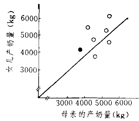 后裔测定方法之一。用与配母牛及女儿的产奶量来估测该公牛种用价值的方法。常用于奶用种公牛。分两种作图法:❶角平分线法。以母亲产奶量为横坐标,女儿产奶量为纵坐标,划出角平分线。标出每对母女产奶量的交点。凡交点在平分线上者,表示女儿产量高于母亲。交点多数位于角平分线的,说明公畜是改良者;交点多数在角平分线下的,说明公畜是恶化者;交点在角平分线附近的,说明公畜是中庸者。❷垂直线法。以纵坐标表示产奶量,畜群平均产奶量用一横线表示。每对母女标以一条垂直线,母亲产奶量用圆点表示,女儿产量用箭头表示;高于母亲者箭头向上,低于母亲者箭头向下。由多数箭头的方向可看出公畜的改良效果。这种方法也简单易行,并且直观。缺点也是母女不处在相同年份里,缺少可比性,已较少使用。