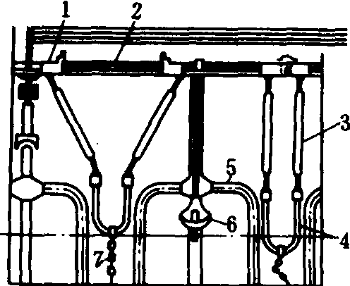 1.滑块; 2.颈架连接连杆; 3.颈架;4.U形架; 5.牛床架; 6.自动饮水器; 7.限位链