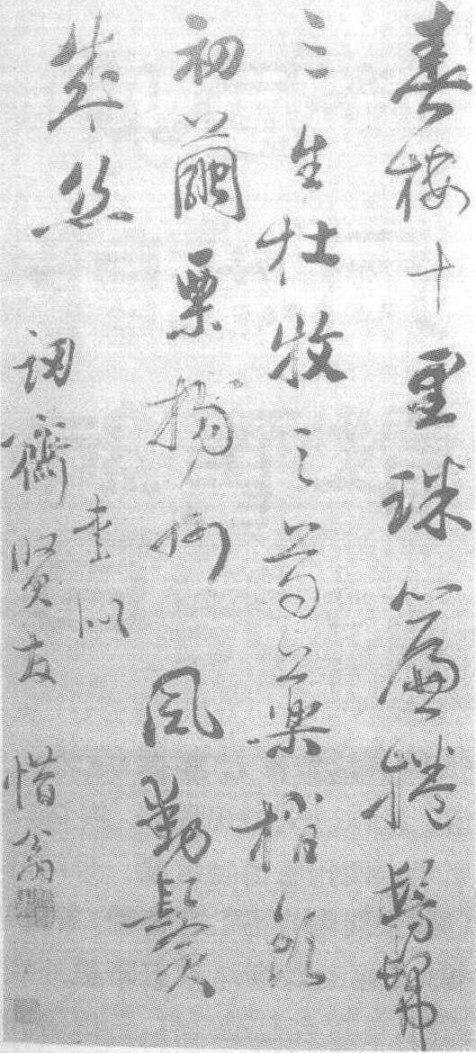 | 释义 | 姚鼐行草书七言绝句轴清。纸本。纵82.1厘米,横38厘米。四川省博物馆藏。姚鼐(见《姚鼐行书游江东诗册》条目)书。所书七言绝句: “春楼十里珠帘卷,仿佛三生杜牧之,芍药梢头初茧栗,扬州风动鬓成丝。”款署:“书似訒斋贤友,惜翁。”款下钤白文:<姚鼐之印>。书体有王献之笔意,一点一画颇有韵致,行笔飘洒自如流畅,章法布局疏朗大方,有儒雅的文士气,增添了全书的超然逸趣。