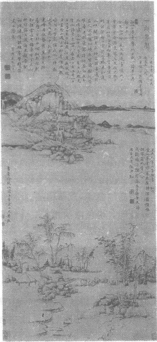 | 释义 | 姜实节一壑泉声图轴清。姜实节绘。纸本墨笔。纵99.3厘米,横46.4厘米。上海博物馆藏。姜实节(公元1647—1709年),字学在,号鹤涧,山东莱阳人,寓居苏州。明礼科给事中。入清后隐居,不入城市,布衣终老。画山水学倪瓒,峰峦简淡,林木萧疏,意境清旷幽深。善书法,笔势如篆籀。亦工诗,著有《焚馀草》。此图描绘了苏州峣峰的景色。近景坡堤上板桥横架,矶石临溪,几棵杂树,枝叶扶疏,树杆细俏,空亭矗立。对岸一峰突起,清泉流急,直泻湖中,湖水清净,给人以平湖清幽之感。远山连绵,墨色稍浓。整个画面布局以及山石的折带皴,皆学倪瓒。构图简单,寂静冷漠,笔墨简洁,意境平远,清旷淡逸,有深秋萧落之感。周围空白处自题盈篇,陈述幼年时和现时游峣峰的前后情景,并题七律一首,书法也近似倪瓒。款题“丁亥康熙四十六年”,即公元1707年十月朔”,实节是年61岁。
