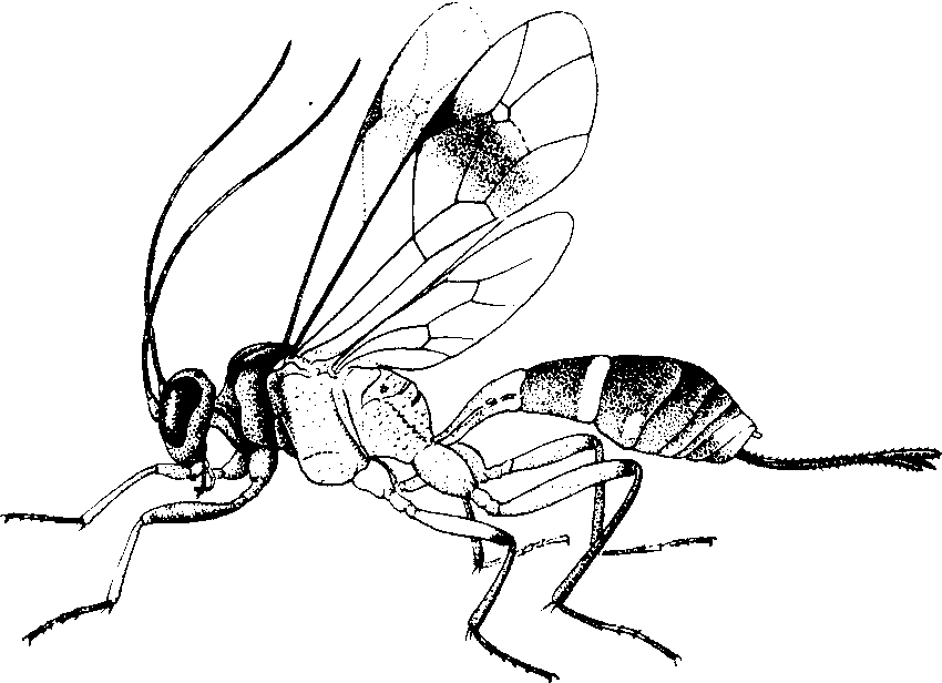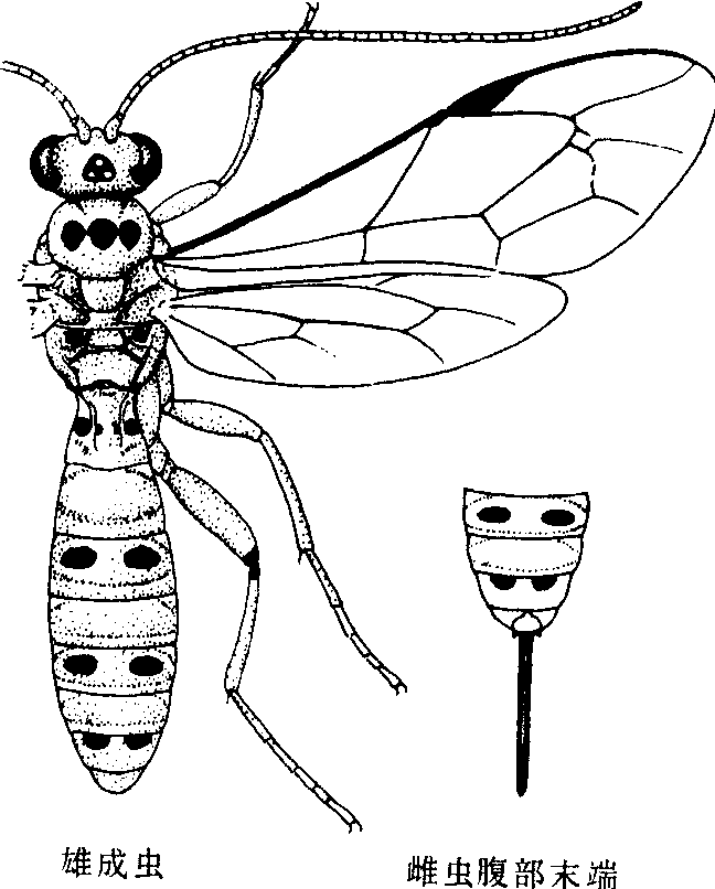 图1 广黑点瘤姬蜂 横带驼姬蜂 学名Goryphus basilaris Holmgren。沟姬蜂亚科。体长7~10毫米。体具黑、赤、白三色。头部、前胸和中胸至翅基片水平处黑色,胸部的其余部分赤色。腹部第一节背板赤色,雌性第一、二节背板后缘和第七节背板白,有时第三节背板两侧还有一白斑;雄性第一至三节背板后缘和第七节背板白,其余黑色。前翅在翅痣下方黑褐色,呈一条较阔横纹(图2)。广布湖北、四川以南各省。单寄生于鳞翅目(如二)化螟、稻纵卷叶螟、稻苞虫、马尾松毛虫、菜粉蝶等)的蛹,亦可寄生于广黑点瘤姬蜂而为重寄生物。