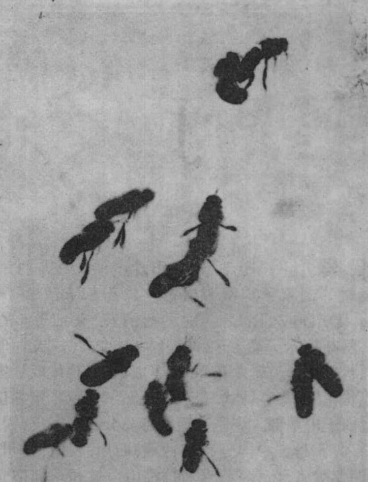 蜂王与雄蜂在空中交配(R.A.Morse 摄) 处女王的婚飞范围很广,平原地区处女王与雄蜂相距18.5千米还有交配现象。处女王交配返巢时,螫针腔常拖着一条白色线状物,这是雄蜂粘液腺排出物堵塞螫针腔所致,亦称为“交配标志”。蜂王的受精囊里贮存着成百万的雄蜂精子,可供一生产卵受精使用;蜂王交配产卵后终生不再交配。 处女王婚飞交配结束后,哺育蜂向它提供丰富的王浆饲料。蜂王在交配后,随着卵巢的发育,体重迅速上升,平均每天增加10毫克以上; 腹部逐渐膨大伸长,行动日趋稳重,多在交配后的第2~5日开始产卵。蜂王在不适宜的气候条件下交配,其所接受的精液量少,产卵后常被蜂群提前以新蜂王交替。 婚飞matin g flight某些昆虫在飞行中进行交配的生理现象。性成熟的处女蜂王与雄蜂的交配就是在远离蜂巢的空中进行的。通常发生在气温达20℃以上的晴暖无风或微风天气的午后2~4时。处女蜂王大多在第一次出巢飞行时交配。一次婚飞可连续与多只雄蜂交配,并且可重复进行交配飞行,直至受精囊贮满精液为止。通常,一次婚飞历时20~30min。蜂王交配返巢时,其螫针腔常带有一条白色线状的“交配标志”。 |
