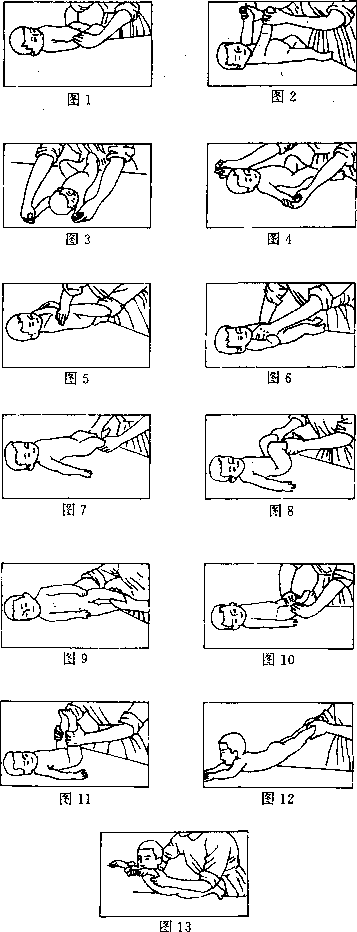 由成人帮助婴儿来完成各种动作的体操,用以促进婴儿动作的发展(见图5.10-1)。大人洗净手,在婴儿吃奶后半小时或1小时,配上乐曲,孩子只要不会着凉,尽量少穿衣服。准备活动:孩子仰卧,大人轻轻抚摸孩子,用亲切的口吻和孩子说话,使孩子情绪愉快、肌肉放松。第一节伸展运动:预备姿势,双手握住孩子手腕,让孩子握住大人的拇指、两臂置于体侧(图1)。动作说明,