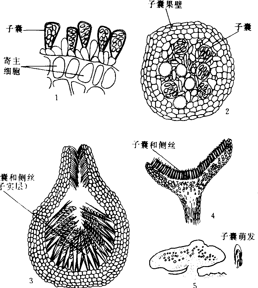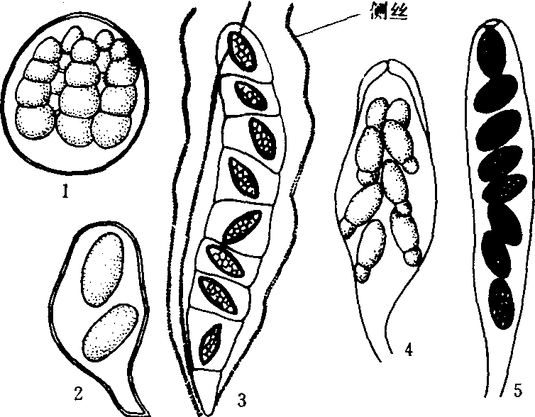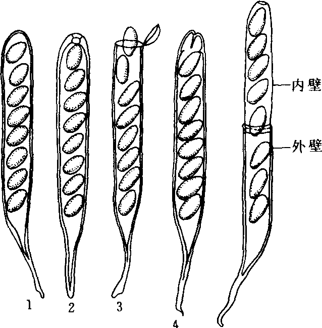 近年的研究表明子囊的结构类型较多,且与子囊孢子的释放有密切关系(图3)。通常根据囊膜的性质分为3类: ❶原壁子囊(protonicate)。具有一层很薄的囊膜,子囊孢子通过囊壁的破裂或消解而被释放。 ❷单壁子囊(unitunicate)。囊膜单层,子囊孢子通过囊顶部小孔、狭缝或囊盖而主动放射。 ❸双壁子囊(bitunicate)。囊膜双层,外层称为子囊外壁,内层称为子囊内壁。其形成过程是首先在子囊母细胞膨大时产生壁原基,尔后生成次生壁。外壁和内壁均由微纤维与非结晶体物质结合而成,差别只在于微纤维的排列方式不同。释放孢子时,外壁因无弹性而保持原位,仅顶端破裂,内壁因有较大的弹性常延伸超出外壁顶端,长度为子囊的2~3倍,孢子通过内壁顶端小孔主动放射出来(图3~5)。子囊的类型是分类的重要特征。