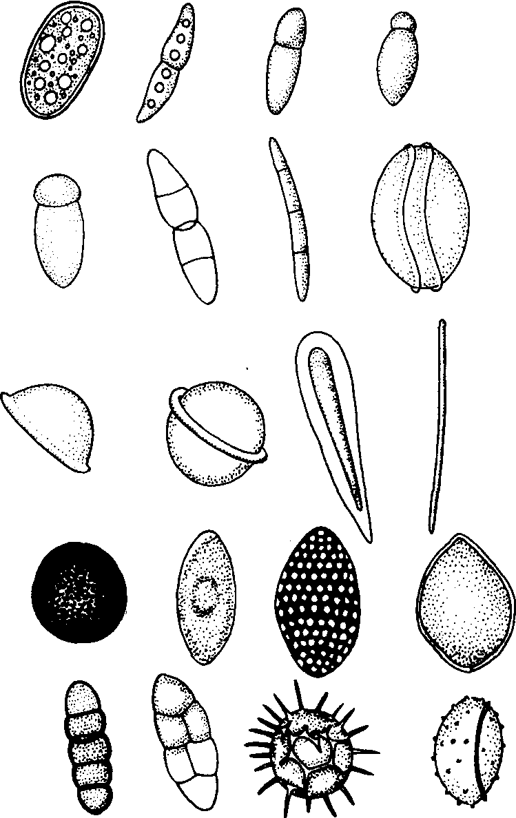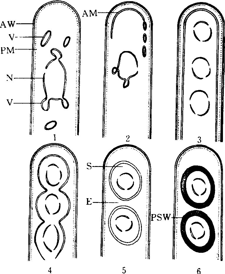 子囊孢子 子囊孢子形成的过程是: 子囊母细胞内双核进行核配,形成短暂的二倍体阶段,以后进行减数分裂和有丝分裂,形成8个单倍体的细胞核。同时,子囊在发育过程中先出现许多双层膜的泡囊排列在子囊周围,以后连结成一个下端开口的具双层膜的圆筒形囊状物,将大部分原生质和8个细胞核包裹在里面,尔后双层膜向核间缢缩,形成8个子囊孢子(图4)。孢壁外所剩的一部分细胞质称造孢剩质,可在子囊孢子发育中起营养作用,有的沉积于孢子壁上形成各种纹饰。子囊孢子形态多样,有圆形、椭圆形、腊肠形、线形和砖格状等,无色至黑色,表面光滑或具刻纹、瘤状或网状突起等,单细胞、双细胞或多细胞(图5)。这些特征是子囊菌分属和分种的依据。子囊内通常含8个子囊孢子,有的少于8个或多于8个。子囊孢子在子囊内呈单行、双行或平行排列。
