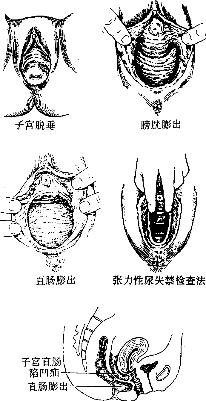 | 释义 | 子宫脱垂与阴道前后壁膨出的病因及表现支持子宫正常位置的韧带、筋膜、肌肉受到损伤,或过度松弛,尤其后位子宫,子宫轴与阴道轴相一致,在腹压增加的影响下,子宫即沿阴道方向向下脱出,导致子宫脱垂(见图7.6-1)。同样,影响盆底组织功能的恢复,使阴道前壁膨出(膀胱膨出)及阴道后壁膨出(直肠膨出)。过去子宫脱垂发生的主要原因是产伤。分娩时子宫口尚未开全产妇即向下屏气用力,急产、滞产、巨大胎儿,困难的阴道手术产,都能使子宫的支持组织及盆底组织伸展或撕裂。如未及时修补,产后又未注意休息,甚至参加重体力劳动,就直接影响其功能的恢复,为子宫脱垂创造了条件;而绝经期后妇女发生子宫脱垂或有些产后轻度脱垂,而到更年期或绝经期后脱垂程度加重。这是因为卵巢功能衰退,雌激素水平低落,生殖器官萎缩,组织缺乏弹性,使子宫各韧带及盆底组织变得薄弱、松弛无力;腹内压力增加,也是病因,如慢性咳嗽,习惯性便秘,慢性腹泻或长期从事蹲、站立、肩挑或搬举重物的体力劳动,也有因腹水等因素使腹内压力增加,使子宫脱垂。发生子宫脱垂后,病人感腰酸、下坠感,有肿物脱出阴道外。最初于用力时脱出,休息、卧床后能自动回缩。发展下去,肿物越来越大,必须用手还纳入阴道,严重时脱物充血、水肿、肥大,甚至无法还纳,长期暴露于阴道口外。因长期摩擦而发生糜烂、溃疡、感染,渗出脓性分泌物,病人行动不便,痛苦异常。伴发阴道前壁膨出(膀胱膨出)者,可发生排尿困难,尿潴留,有尿道膨出时,可发生压力性尿失禁,在大笑、咳嗽、用力等增加压力的情况下,有尿液逸出。有阴道后壁膨出(直肠膨出)者,可有排便困难。