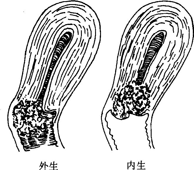 | 释义 | 子宫颈癌的临床表现宫颈不典型增生、原位癌、镜下早浸癌甚至刚开始的深部浸润癌,宫颈表面无特殊异常,可有正常外观,或如一般的糜烂,逐渐成为表面粗糙的颗粒状糜烂,容易出血。随着浸润癌(见图7.3-3)的出现,宫颈癌可表现为外生型,又称菜花型,癌组织呈息肉样或乳头状向外生长;内生型,又称浸润型,癌组织向宫颈深部组织浸润,宫颈肥大而硬;不论外生型或内生型进一步发展后,癌组织坏死脱落形成溃疡,甚至整个宫颈为一大空洞所代替。不典型增生,原位癌及镜下早浸癌一般无症状,可有接触性出血(性交后、大便后或检查后)。早期宫颈癌可无症状,约40%的Ⅰ期癌病人无症状,而是通过防癌检查发现的。较早的症状有少量的接触性出血,绝经后间断性出血或血性白带。晚期流血增多,甚至因较大血管被侵蚀而引起致命的大出血。阴道有大量米汤样恶臭白带流出。疼痛是很晚的症状,表示宫颈旁组织已有明显浸润,并已累及盆壁,闭孔神经、腰骶神经等,可出现严重持续的腰骶部或坐骨神经痛。由于淋巴结转移,淋巴管阻塞,可发生单侧腿肿。晚期癌瘤压迫或侵犯膀胱可有尿频、排尿困难、甚至形成膀胱阴道瘘。输尿管受压可引起肾盂积水,二侧输尿管阻塞可引起尿毒症并引起死亡。侵犯直肠可引起腹泻、里急后重或粪瘘。到晚期由于贫血及感染,可有消瘦、发热、恶液质的现象。宫颈癌的主要扩散途径为直接蔓延和淋巴结转移,血行转移较少。