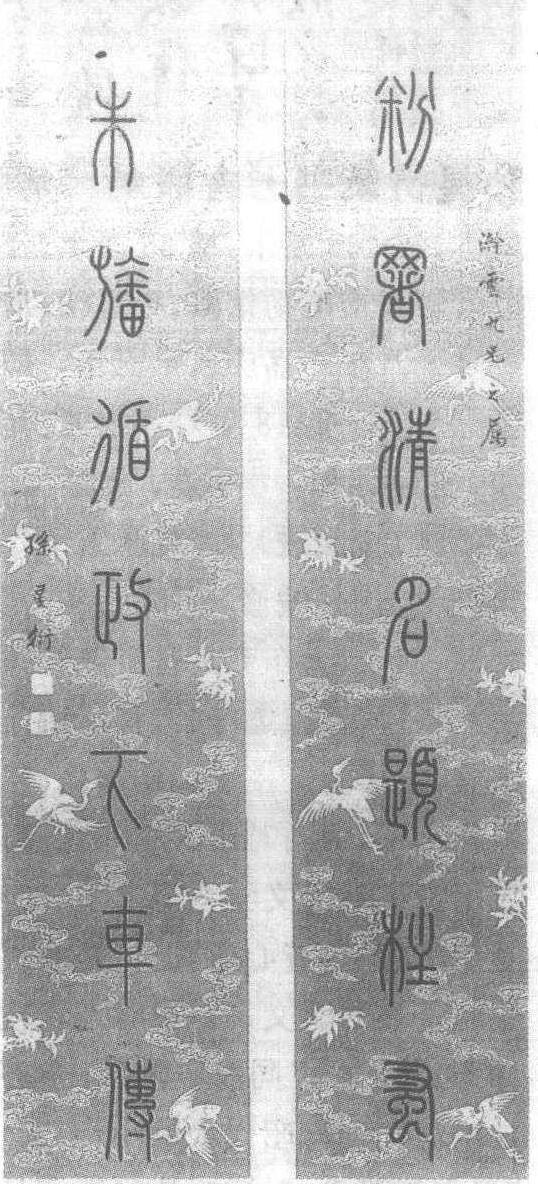 | 释义 | 孙星衍篆书七言联句清。绢本。纵166厘米,横35厘米。江苏省常州市博物馆藏。孙星衍(清乾隆十八年—嘉庆二十三年,即公元1753—1818年),字伯渊、苑如,亦字渊如,号季逑、薇隐,江苏阳湖(今武进)人。乾隆五十二年进士,历任编修、刑部主事、员外郎、郎中、山东兖沂曹济兼管黄河兵备道、督粮道等官。嘉庆四年罢官,侨居金陵主讲钟山书院。曾入毕沅幕,为当时学人多所往。孙星衍深究经史文学音训之学,旁及诸子百家,皆心通其义,是清代中叶著名的骈文家,被时人袁枚称为:“奇才。”同时研校勘、金石之学。清吴修《昭代尺牍小传》云:“渊如工篆隶。”清钱泳《履园丛话》云:“渊如观察守定旧法,当为善学者。微嫌取则不高,为梦英所囿耳。”清洪亮吉《北江诗话》云:“吾友孙君星衍,工六书篆籀之学。”其传世著作甚富,辑刊有《平津馆丛书》,著有《尚书今古文注疏》、《周易集解》、《芳茂山人诗录》、《晏子春秋音义》、《京畿金石考》、《岱南阁集》、《寰宇访碑录》、《平津馆金石萃编》等。《清史稿》卷四百八十一有传。此七言联句:“粉署清名题柱蚤,朱幡循政下车传。”上联款署:“瀚云九兄之属”,下联款署:“孙星衍”。款下钤朱文〈孙氏伯渊〉、白文〈人之乐事惟读书〉两印。孙星衍书篆时毛笔是剪去笔尖的,这样其书有万毫平铺的效果,使字沉着内蕴。其书字体瘦劲有致,行笔圆润浑厚,笔法娴熟流畅,线条柔中带刚,刚柔相济,有醇朴妙绝之趣,是孙星衍篆书的代表佳作。