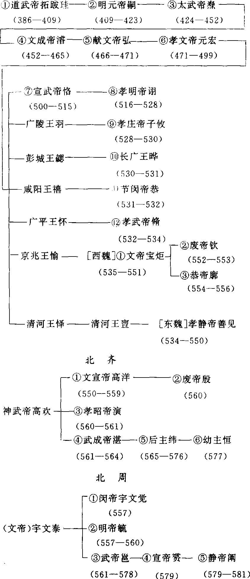 | 释义 | 孝文帝改革Xiaowendi gaige北魏孝文帝在位时实行的政治改革。北魏统一中国北方后,一直以平城(今山西省大同)为都,遥制中原,保留着鲜卑旧俗。对百姓剥削压迫严重,各族人民的反抗斗争不断发生,为了缓和各种社会矛盾,更好地统治北方人数众多的汉族人民,孝文帝在位期间(471—499)接受了一些汉族地主的建议实行了一系列汉化政策和政治改革。首先,在太和八年(484)颁行百官俸禄制。以前,北魏官吏没有俸禄,可以任意向人民掠夺。俸禄制的颁行缓和了百官与人民间的矛盾;其次为了保证封建政府的财政收入,太和九年孝文帝又颁布了均田令,由政府把掌握的土地分配给农民耕种,成年男子受露田40亩、桑田20亩,成年女子受露田20亩。一夫一妇每年向国家交纳粟二石,帛一匹,丁男还要服徭役和兵役。均田制使无地或少地的农民成为国家编户,国家的徭役赋税有了保证。另一方面,农民的生活也比较稳定,有利于北方经济的恢复和发展。第二年,又废除了旧的宗主督护制,代之以三长制,即设党、里、邻三长,健全了基层政权组织;太和十八年,迁都洛阳,进一步加强了对北方地区的控制力和与黄河流域汉族地主阶级的联系。除此之外,孝文帝还实行了一系列汉化政策,如鼓励鲜卑与汉通婚,令鲜卑贵族改用汉姓,改穿汉族的服装,改说汉族等,还仿照南朝的典章制度,改订制度。北魏孝文帝的改革,顺应了历史发展趋势,加速了北方各少数民族封建化的过程,推动了北方经济的发展,促进了北方民族的大融合。 北 朝 帝 系 表 北魏(包括东、西魏)