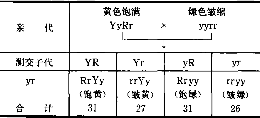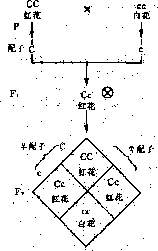 分离定律 一对遗传因子在杂合状态下彼此独立,互不影响,形成配子时自由分离到不同配子中,子二代出现3:1的性状分离。孟德尔将纯系的红花豌豆与白花豌豆杂交,其子一代(F1)全部开红花。子一代自花授粉所得子二代(F2)中,有705株开红花,224株开白花,红花植株与白花植株之比接近于3:1。孟德尔研究的其他六种相对性状差异明显的纯系杂交结果也相同(表1)。子一代中能表现的性状称为显性性状 (如红花),未表现的性状称为隐性性状(如白花)。显性性状与隐性性状同时出现称为性状分离。孟德尔认为显性性状与隐性性状分别由遗传因子控制,在体细胞里遗传因子成对存在,配子中遗传因子成单存在。例如红花豌豆纯系植株的体细胞内有一对决定显性性状的遗传因子CC;白花豌豆纯系植株的体细胞内有一对决定隐性性状的遗传因子cc。两者的配子分别含有一个C或c,两亲本杂交形成的子代含有Cc。C对c是显性,所以子一代植株全开红花。子一代产生配子时,C与c分配到不同配子中去,产生比例相等的C配子与c配子。含C或c的雌配子与雄配子随机结合产生的子二代中,CC与Cc开红花,cc开白花; 群体中红花植株占3/4,白花植株占1/4,即3:1(图1)。 独立分配定律 两对或两对以上的遗传因子在配子形成过程中,同对因子独立分离,不同对因子自由组合。杂交的子二代(F2)中按(3:1)n 出现各种性状的组合,n为遗传因子对数。孟德尔选取两对性状有差异的豌豆,黄色、饱满籽粒的纯系与绿色、皱缩籽粒的纯系进行杂交,其子一代都是黄色饱满籽粒。子一代自花授粉所得子二代有四种类型: 黄色、饱满籽粒(315粒),黄色、皱缩籽粒(101粒),绿色、饱满籽粒(108粒)和绿色、皱缩籽粒(32粒)。接近9:3:3:1。据此孟德尔认为,黄色、饱满籽粒豌豆亲本体细胞内有两对控制显性性状的遗传因子YY与RR;绿色、皱缩籽粒豌豆亲本体细胞内有两对控制隐性性状的遗传因子yy与rr。两者的配子分别含有YR与yr,杂交形成子一代是YyRr。因Y对y是显性,R对r是显性,子一代全是黄色、饱满籽粒。子一代形成配子时,每对遗传因子Y与y、R与r各自分离,因此两对性状的杂种二代分离比是 (3:1)2 ,即9:3:3:1(图2)。孟德尔研究的七对相对性状中,任取两对性状进行杂交都得到相同结果。 为了验证杂合体中既存在显性遗传因子又存在隐性遗传因子(Cc或YyRr)和遗传因子的独立分离与自由组合,孟德尔首创了测交法——将待测的杂合体(F1)与隐性纯合体进行杂交。由于隐性纯合体只提供隐性因子,所以待测杂合体的显性因子和隐性因子在测交子代中都有充分的表型效应。从而可直接判断杂合体的基因组成。例如杂合体YyRr与双隐性亲本yyrr回交,测交子代得黄色、饱满籽粒(31粒),黄色、皱缩籽粒(27粒),绿色、饱满籽粒(31粒)和绿色、皱缩籽粒(26粒),接近1:1:1:1(表2)。说明黄色、饱满籽粒杂合体(F1)形成配子时,每对遗传因子自由分离而各对遗传因子间又是独立分配(自由组合)的。 孟德尔的成功在于: ❶选用了性状区分明显、严格自花授粉的豌豆品种作为研究材料; ❷对性状逐一进行研究,计数杂种世代中具有显性或隐性性状的个体数,加以统计分析。阐明一对性状的遗传规律后,再研究两对以及多对性状的遗传规律。这一研究方法成为1900年以后普遍使用的方法。他的试验结论成为具有普遍意义的遗传学基本规律。育种工作者根据性状分离和独立分配定律,能预见杂交后代性状出现的概率,提高选择效果,有利于动、植物新品种的选育工作。