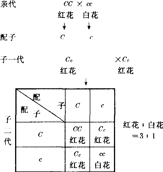 孟德尔定律孟德尔创立的遗传学最基本的规律。包括1.分离定律:假设性状是由遗传因子(基因)决定的,在体细胞中遗传因子成对存在。在配子(生殖细胞)形成进入不同的配子中。如在豌豆中,C和c分别是决定红花和白花的一对遗传因子(一对等位基因),C对c是显性。红花豌豆CC和白花豌豆cc杂交,分离情况如下图:
