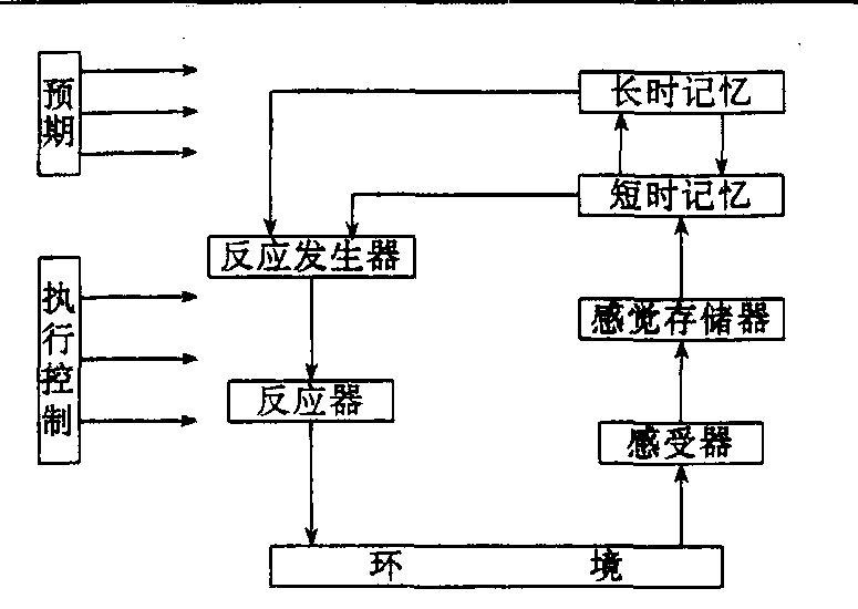 美国心理学家R. M.加涅运用现代信息加工理论描述学习过程的一种模式 (图见下页)。来自环境的信息输入对感受器的作用所产生的信息流,通过感觉储存器的知觉编码,进入短时记忆。在短时记忆中对信息进一步处理, 把新信息与已有的有组织的信息联系起来,转换成表象、概念等形式加以储存并转入长时记忆。长时记忆中的信息,既可作为进一步学习之用,也可作为“反应发生器”的输入项目,并通过“反应器”做出反应。以后通过反馈来了解是否达到了预期的学习效果,从而强化学习的作用。“预期”和“执行控制”指导着学习引起的操作和反馈。