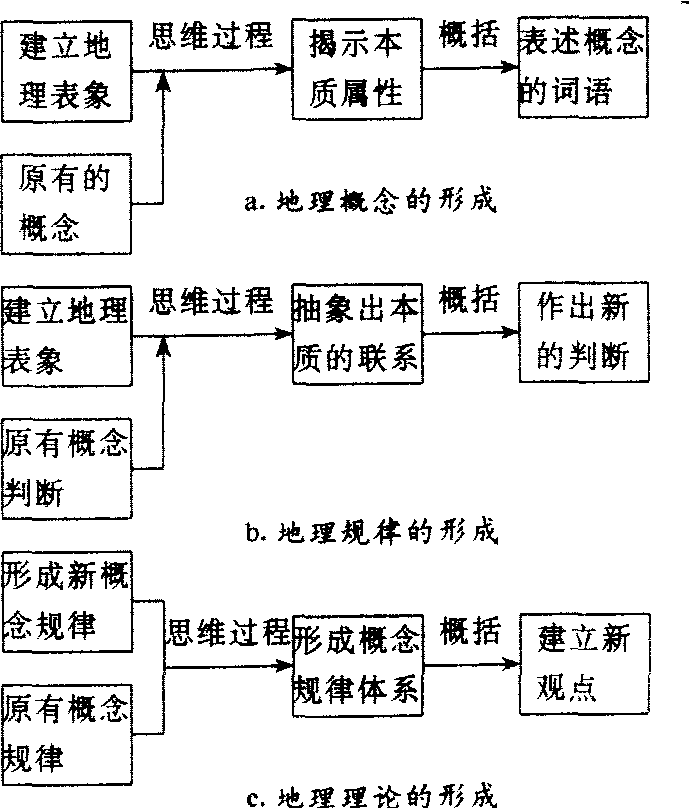 地理理性知识包括地理概念、地理规律和地理理论。地理概念是反映地理事物一般的、本质特征的知识。根据其反映地理事物的性质,地理概念又可分为单独地理概念,如北京、黄河、非洲等等反映特定地理事物本质属性的概念;一般地理概念(又称普通地理概念),如地形、气候、城市、工业等等反映同一类地理事物共同的本质属性的概念;集合地理概念,如非洲的地形、北京的气候、日本的工业布局等等反映一定区域内同一类地理事物共同本质属性的概念。地理规律是反映地理事物间本质联系和发展过程中必然趋势的知识。按照联系的性质,地理规律又可分为地理空间分布规律,如气温垂直递减率、自然带的带性分布、工业的“临海型”布局等等反映地理事物与空间位置之间必然联系的知识;地理空间联系规律,如空气和水对岩石的风化作用、交通线对工业发展的促进等等反映各种地理事物之间本质的和必然联系的知识;地理演变规律,如生物季节性和周期性变化规律、地球水循环运动、城市化进程等等反映地理事物发展变化必然趋势的知识。地理理论是由一系列相互联系的地理概念和规律组成的地理知识体系,如人地关系和谐论、板块构造学说等等反映广阔领域中地理事物本质特征及其规律的知识。所有这些地理理性知识都是反映地理事物本质特征和必然联系的知识,是人们对地理感性知识所反映的地理事物的一般属性,进行抽象、概括等等思维过程后得出来的。所以,学生学习地理理性知识时,一般要以感性知识为基础,即在建立被研究地理事物表象的基础上,经过一系列的地理思维过程,才能真正获得地理理性知识。但学习三类地理理性知识的具体过程也不尽相同(见图a、b、c)。