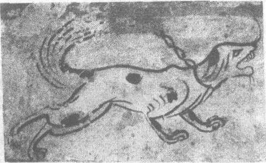 | 释义 | 守门犬图砖画西晋。纵17厘米,横36厘米。甘肃省嘉峪关新城5号墓前室北壁券门的左上角砖画,与猎兔图相对。甘肃省博物馆藏。图中绘一花斑悍犬,正在狂吠。犬的身形瘦长轻捷,四肢健壮有力。它尾部上卷,一足着地、三足腾空,吼叫着扑向前方,口中露出一排锋牙利齿。犬被连在其项圈上的一条铁链牵住,铁链伸向后上方,被拉得笔直,与上纵的犬身形成了一个夹角,造成了一种力量上的均衡。画面中并没有人物出现,但可以想见,人在这只扑叫的悍犬面前一定会望而却步。吠犬的形象写实,神态描绘非常生动。