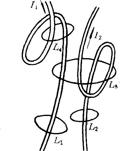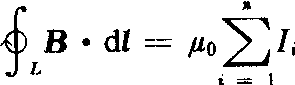 式中∮LB·dl与积分回路L的形状无关,只与穿过回路的电流有关。 表示穿过回路电流的代数和。电流Ii为代数量,当电流方向与回路的积分方向成右手螺旋关系时,Ii取正号,反之取负号,与不穿过闭合回路的电流无关。所谓穿过闭合回路的电流是指穿过以闭合回路为边线所张的任意曲面的电流。只有稳恒电流(稳恒电流必然是闭合的)才能满足安培环路定理的要求,所以安培环路定理只对稳恒电流成立。安培环路定理说明了磁场的性质,磁场是不是保守场。例如,对图中所示的四个回路,可分别写出![]() 当有介质存在时,介质被磁化,出现磁化电流I′,I′对磁场也有贡献,有磁介质存在时的安培环路定理是以H的环路积分表达的。真空中的安培环路定理可看作有磁介质存在时的安培环路定理的特例。有磁介质时的环路定理可看作真空中环路定理的推广形式。安培环路定理除说明磁场的性质外,还可应用它解题。电场中的高斯定理可以用来计算某些电场E的分布具有一定对称性的带电体的电场。与之类似。安培环路定理也可用来计算某些磁场B的分布具有一定对称性的载流导线的磁场。 由∮LB·dl=μ0∑Ii可看出,若B在回路L上有某种对称性,则磁感应强度B可以从积分号中提出,于是可应用该定理方便地求得B。