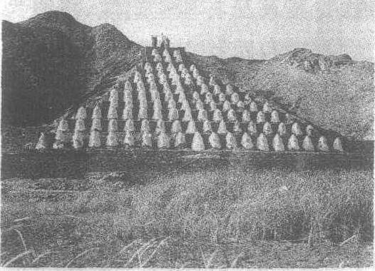 | 释义 | 一百零八塔古代喇嘛塔群。《朔方道志》:“百八塔,在青铜峡内黄河岸左,有古塔一百八座”。《甘肃新通志》亦有记载。始建年代不详。塔群坐西朝东,背山面河,从上到下,按奇数从一到二十一排成12行。均实心,砖砌,外敷白灰,并有彩绘(已脱落)。处于第一排的一座,形体最大,高3.5米,塔基呈方形,塔身为覆钵式,面东有小龛。以下各排,均高2.5米,八角,须弥座,宝珠式塔顶。二至四排塔身为鼓腹尖锥状; 五至六排,塔身呈葫芦状; 七至十二排,塔身呈宝瓶状。民间传说以为这里是穆桂英摆设 “天门阵”和“点将台”之地。 一百零八塔位于宁夏回族自治区青铜峡市峡口山的陡峭山坡上。塔背山面水,依山势分级而建,按一、三、五、七、九……奇数排成12行,构成一个正立的等边三角形的塔群。塔总数为108座,形制相同,砖砌八角形须弥座,为实心,覆钵式喇嘛塔,外表涂白灰,顶为宝珠式。最上一塔形体极大,以下各层逐渐缩小。这种塔群建筑是我国古塔中的孤例。关于塔的创建年代不见记载,明中期史籍中已称其为“古塔”。从形制看,为元代内地新出现的喇嘛教式塔,与北京元代妙应寺舍利塔类似,故有学者认为始建于元代。现已被列为全国重点文物保护单位。
