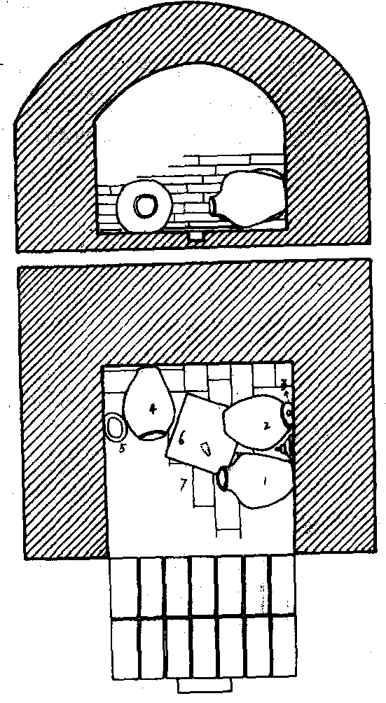 (1.青花盖罐、2. 4褐釉陶罐、3. 绿釉碗、5.绿釉盘、6. 石墓志、7. 银铲) |