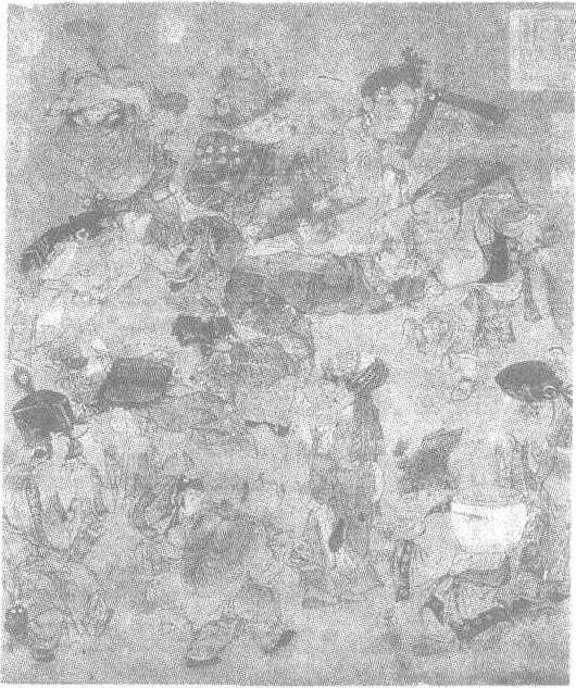 | 释义 | 宋人大傩图轴南宋。无款。绢本设色。纵67.4厘米,横59.2厘米。北京故宫博物院藏。这是一幅描写民间驱除厉疫习俗的风俗画。“傩”即指借祭神来驱除厉疫。图中的人物各司其职,有戴假面具的、有拿法器的、有击鼓的,手舞足蹈,相貌奇古,举止怪诞,反映出现实中的人们对厉疫的恐惧,以及借助这种神的力量驱除厉疫的强烈愿望,此图构图新奇,衣纹细致,人物夸张,栩栩如生。设色妍美富丽,不仅具有很高的艺术价值,而且为研究宋代民间习俗提供了生动的形象资料。